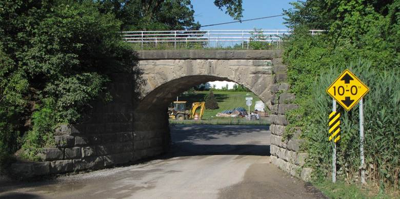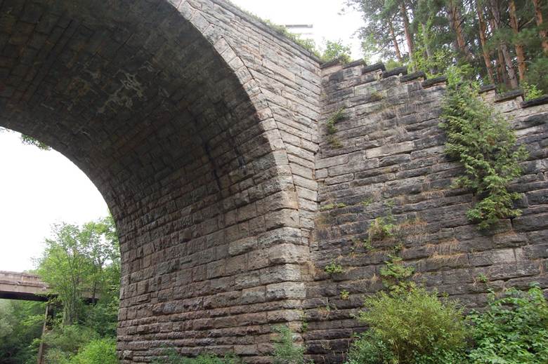 Constructed using locally sourced sandstone, the bridge features three broad masonry arches, each defined by carefully aligned stone courses and pronounced archivolts. Unlike earlier railroad bridges, this structure was designed for vehicular and pedestrian traffic, signaling a shift toward modern infrastructure.