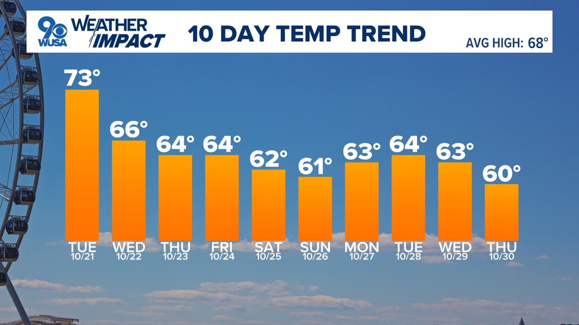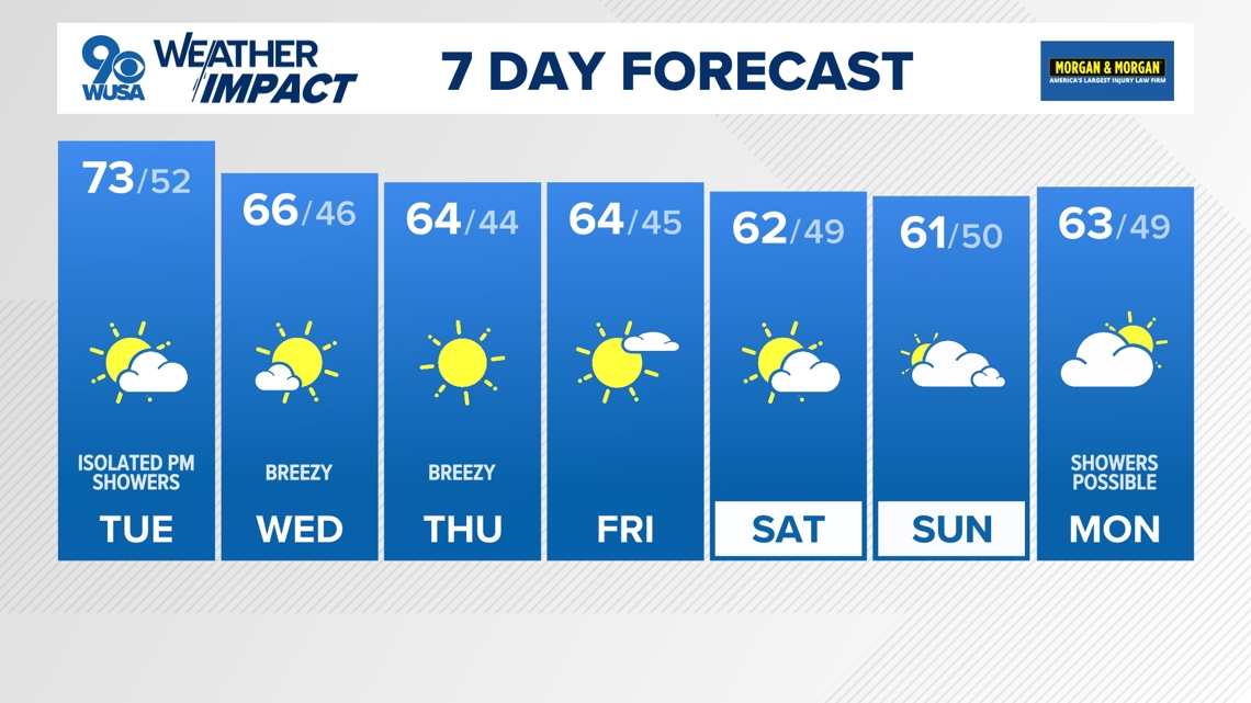Tuesday afternoon will be a bit milder thanks to a southerly breeze. High temperatures will make it into the low 70s under mostly sunny skies. By the evening, a few passing showers will try and blow through the region ahead of a cold front. Most areas stay dry, but don’t be surprised if you have a quick, light shower – especially north and west of DC.