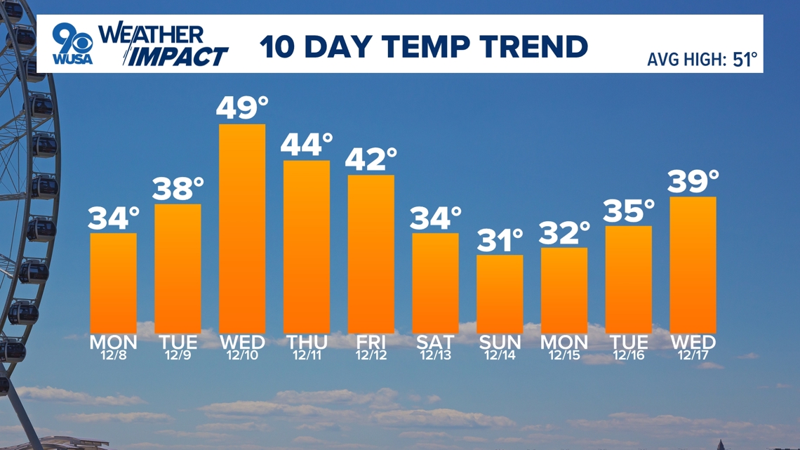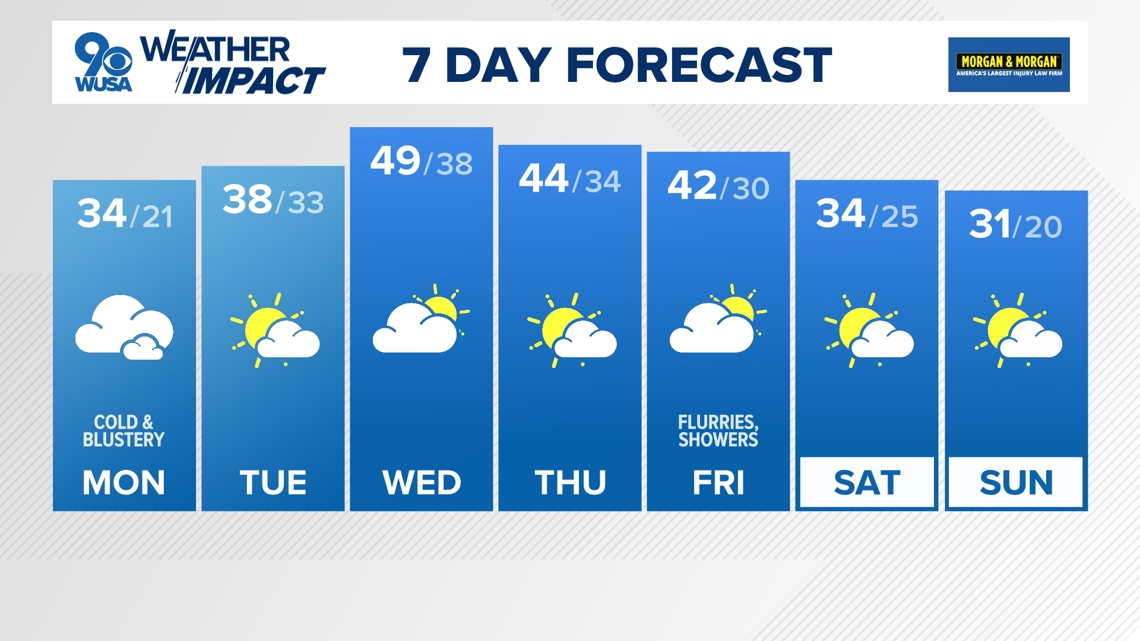 Very cold air moves in on Monday with high temperatures only in the low 30s. However, gusty winds will make it feel more like the 20s, so be sure to bundle up. Temperatures will stay below average for the entire week.