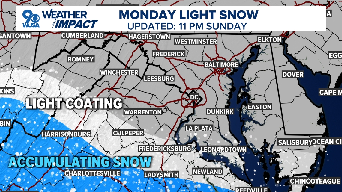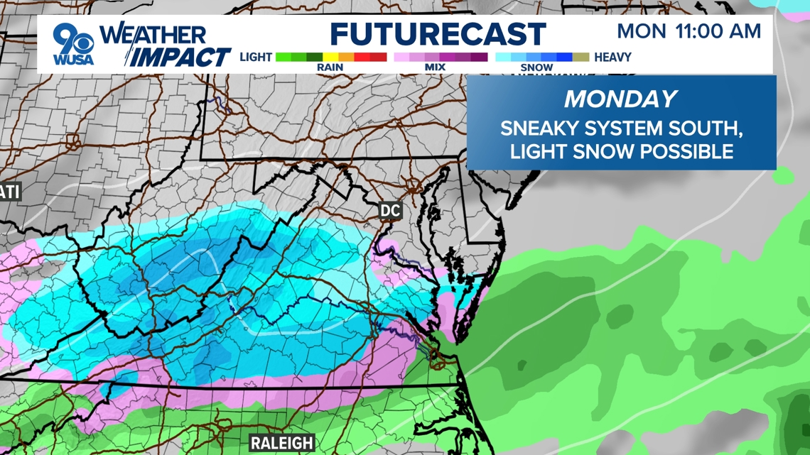 As the cold air moves in on Monday, an area of low pressure will pass by to our south bringing with it a period of light snow or flurries just south of DC Monday morning through perhaps early afternoon. A light coating can’t be ruled out for areas such as Fredericksburg, Orange, and Culpeper. However, heavier precipitation could bring some accumulation (an inch or two) to areas like Staunton and Harrisonburg, but the DC Metro should stay dry. If you’re traveling even farther south to perhaps Richmond, several inches of snow will be possible. Be safe if traveling south.