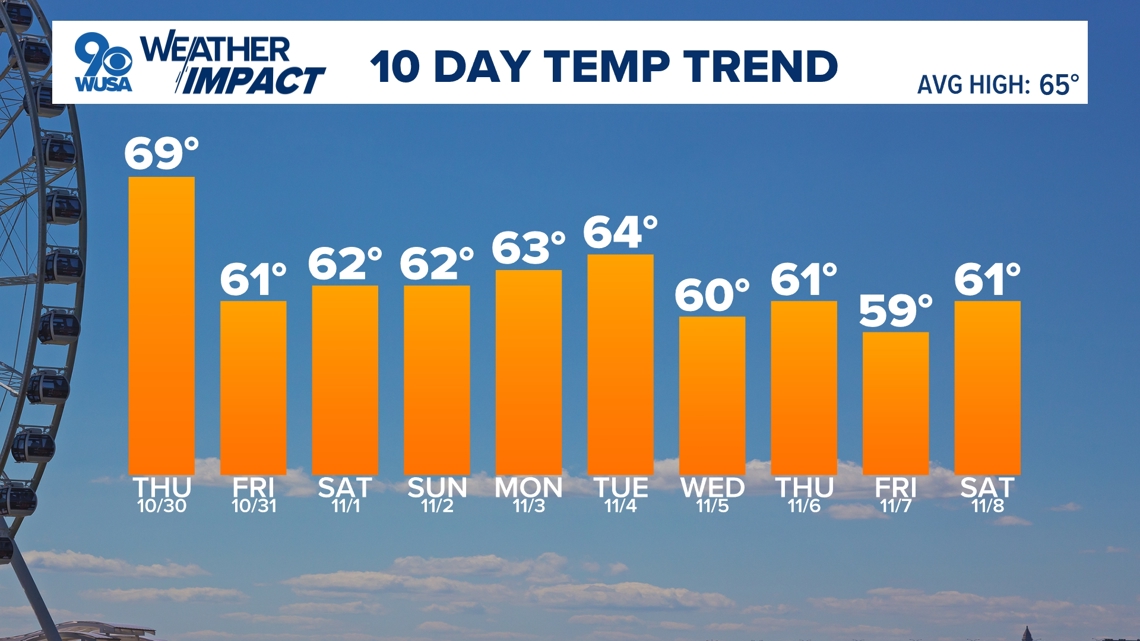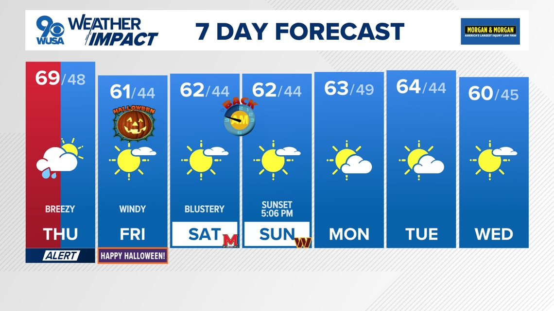 Friday will feature mostly sunny skies and chilly temperatures in the 50s and low 60s. It will also be very windy with gusts up to 30 mph. By trick or treating time, it will be quite cool in the low 50s with blustery wind.