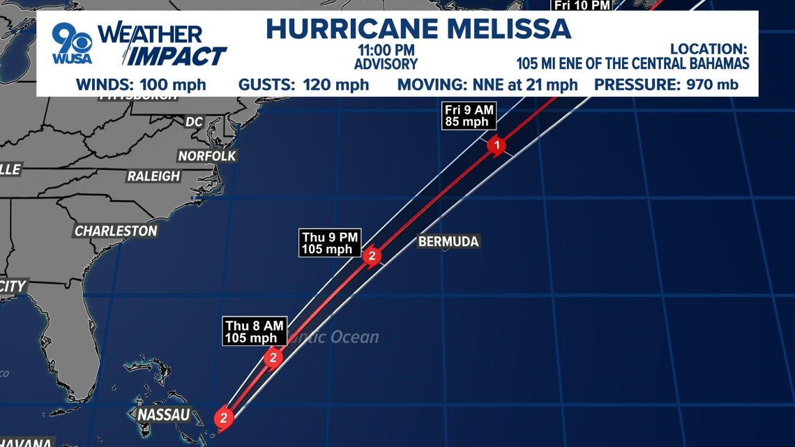 Hurricane Melissa made landfall near New Hope, Jamaica shortly after 1 p.m. Tuesday afternoon. The storm made a second landfall early Wednesday morning in eastern Cuba as a Category 3 hurricane. From there, the storm continues its track northeast into parts of the Bahamas late Wednesday. By late Thursday night, the storm will brush just to the west of Bermuda.