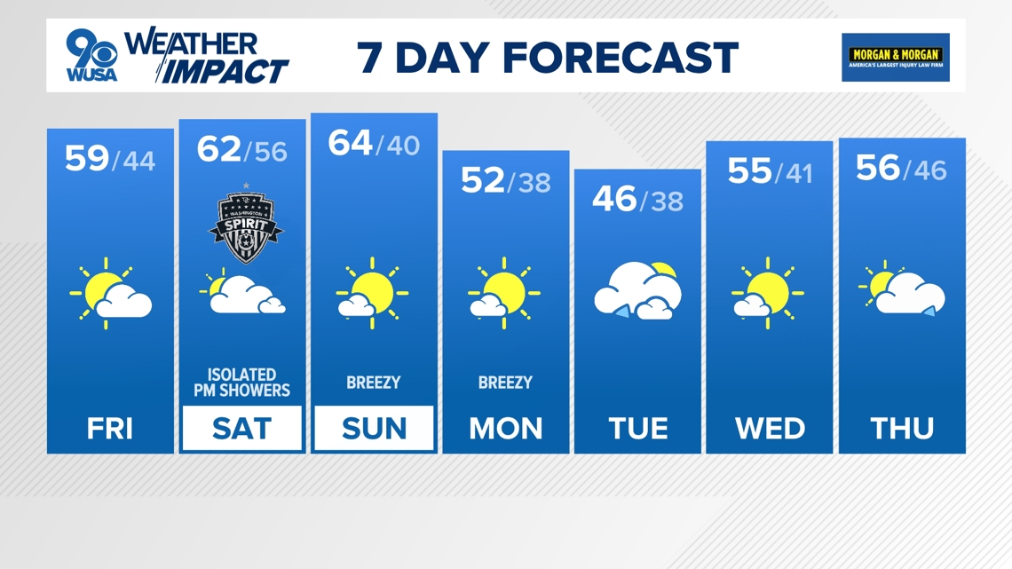 Sunday will be a windier day with temperatures falling throughout the afternoon. Dress for the mid 50s if you have outdoor plans Sunday afternoon. It will the the brighter of the two weekend days with mostly sunny skies.