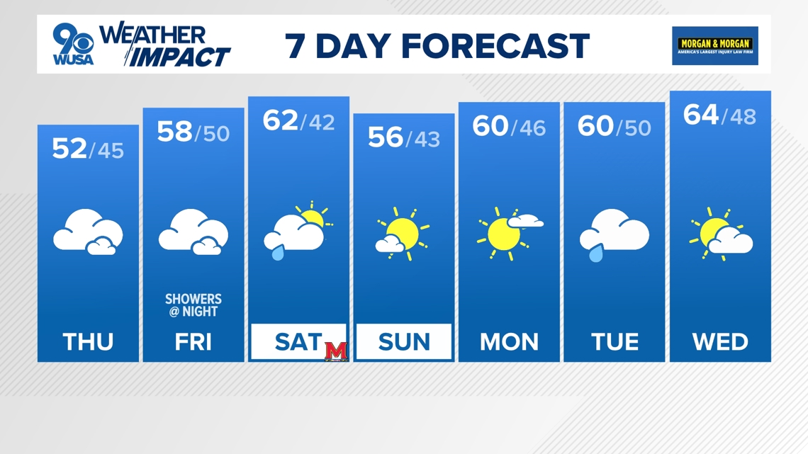 Thursday will be very similar to Wednesday with mainly cloudy skies and cool temperatures in the upper 40s and low 50s.