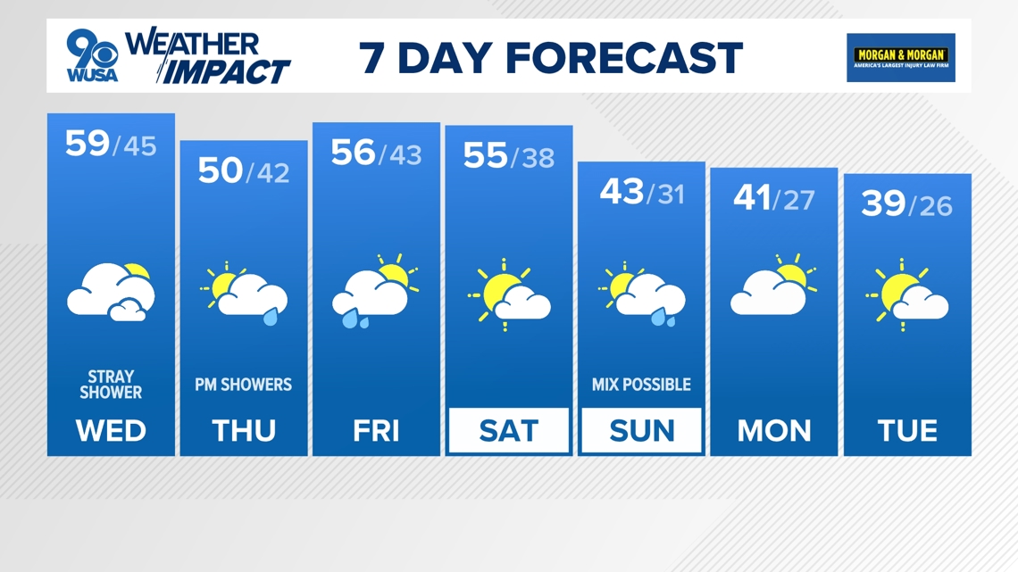 A few stray showers possible Wednesday before more wet weather arrives Thursday into Friday.