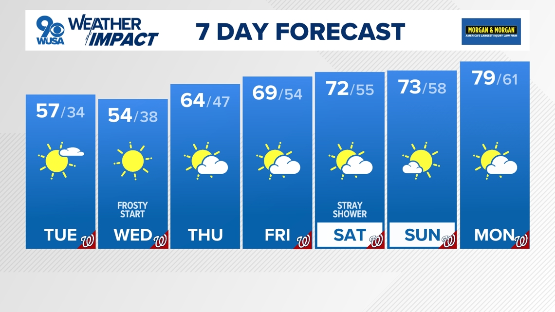 Have layers ready through the middle of the week, as overnight temperatures will also fall to the 30s, and even 20s for a few spots through Thursday morning. We remain chilly Tuesday and Wednesday with highs only in the low to mid 50s.