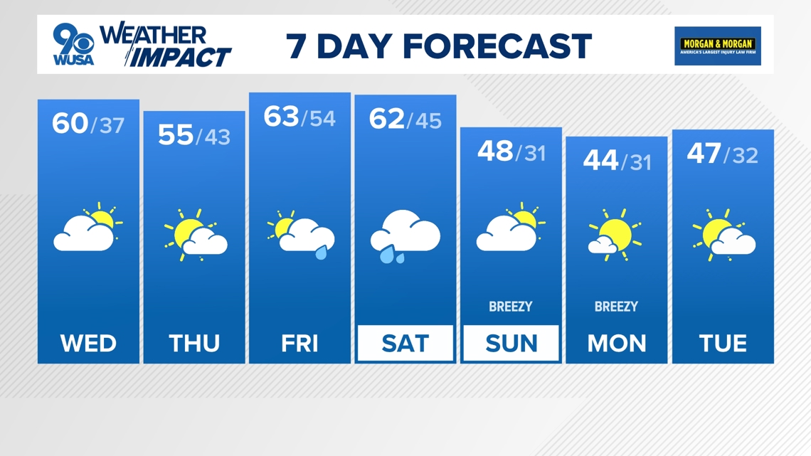 Look for rain as early as Friday night after 7 p.m. Showers will last through most of the day Saturday with breezy winds. A strong cold front will knock us back into reality with highs returning to the 40s Sunday.