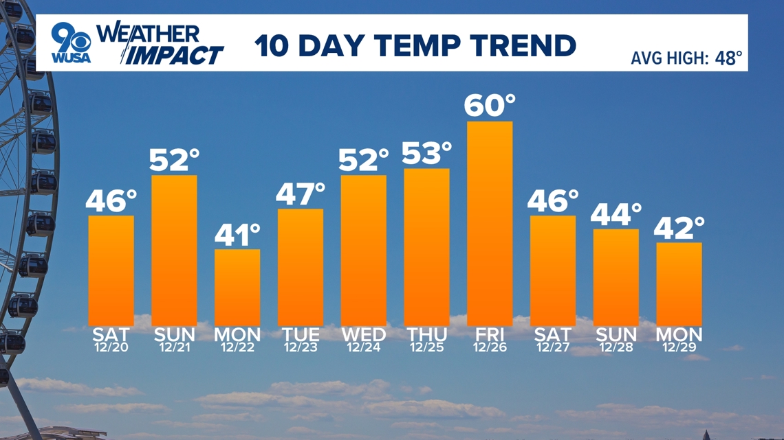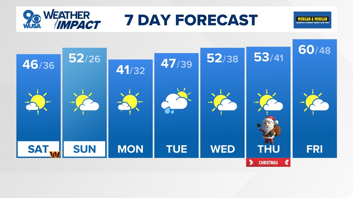It will be a great weekend for outdoor activities with highs in the 40s Saturday and low 50s Sunday. Both days will also feature nice sunshine. It will still be noticeably breezy over the weekend, but nowhere near as windy as Friday. Plan on temps in the 30s for the Commanders game Saturday night.