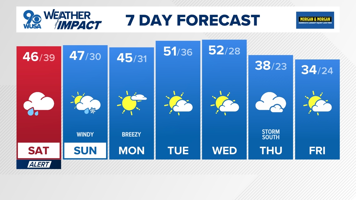 Saturday: Cloudy and chilly with rain and showers, heavy at times. Highs: 44 – 49. Winds: NE 10.
