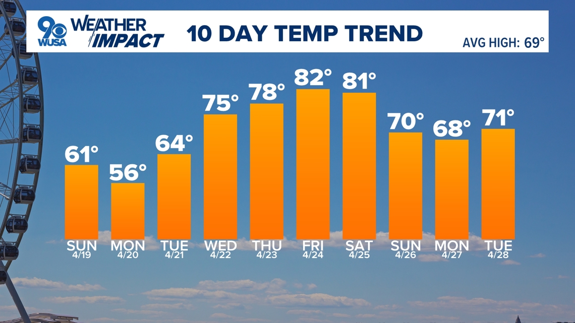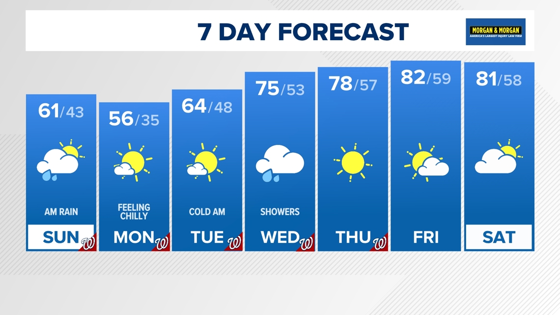 Weather conditions start to change overnight. Clouds come first, followed by showers and downpours from about midnight Saturday through midday Sunday. Temperatures will stay fairly comfortable overnight, but Sunday afternoon temperatures will only rise into the lower 60s here in DC, outside of town, neighborhoods may stay in the 50s. It will be breezy too, adding to the chill, northwesterly winds will be sustained from 10-15 mph, with gusts from 20-25 mph.