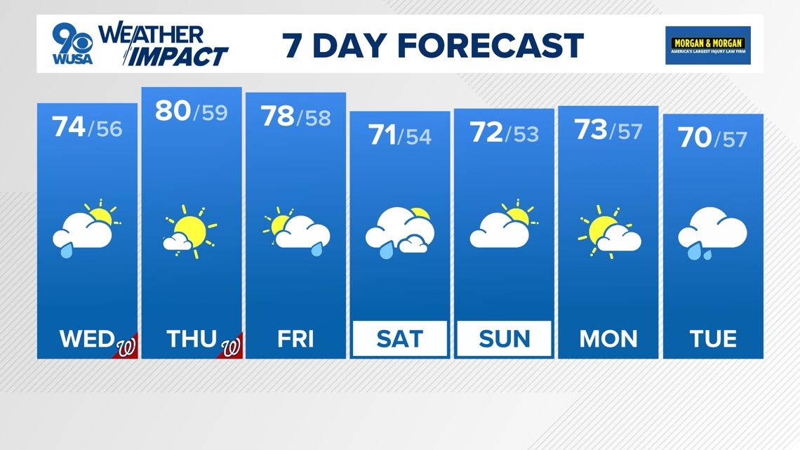 Thursday will be the pick of the week with mostly sunny skies and high temperatures back near 80. Friday will start off dry before showers develop in the evening. This will lead us into a damp start to the weekend with some showers around on Saturday. It won’t be an exceptionally wet day, but you will likely need to adjust some outdoor plans. Stay tuned for exact timing of our Saturday rain chances as we get more data.